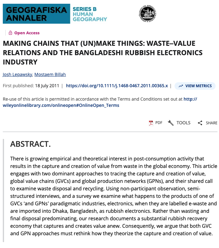 Lepawsky, Josh. Reassembling Rubbish: Worlding Electronic Waste. MIT Press, 2018.